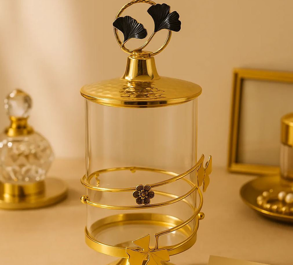 Luxury Golden Ginkgo Glass Storage Jar – Elegant Decorative Container with Floral Metal Wrap